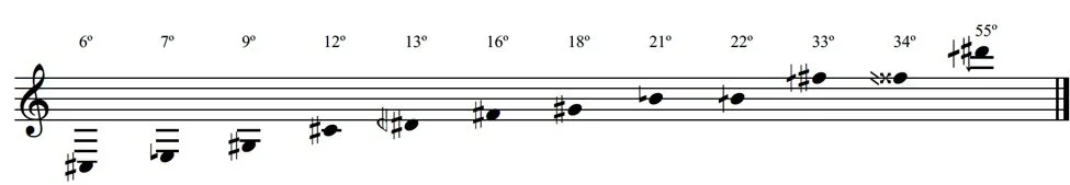 This diagram uses The Helmholtz-Ellis JI Pitch Notation devised by Marc Sabat and Wolfgang von Schweinitz to accurately depict Just Intonation tunings. (https://plainsound.org)